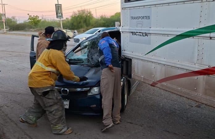 De acuerdo con la información recabada en el lugar, el conductor de un camión blanco de transporte de personal circulaba por la calle José Aguilar Barraza con dirección al sur. Al llegar al cruce con el bulevar Centenario, intentó dar vuelta hacia el oriente, presuntamente sin percatarse de que se aproximaba un Honda Civic azul marino, que avanzaba con dirección al poniente.